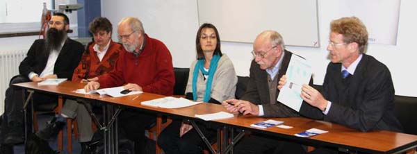 Mitglieder der KLAK-Arbeitsgruppe stellen auf einer Pressekonferenz in Berlin im Januar 2010 das KLAK-Perikopenmodell vor. Von rechts nach links: Dr. Michael Volkmann (Vorsitzender der KLAK), Wolfgang Raupach-Rudnick, Gabriele Zander, Ulrich Schwemer, Katja Kriener, Dr. Timotheus Arndt, nicht auf dem Foto Prof. Dr. Alexander Deeg.